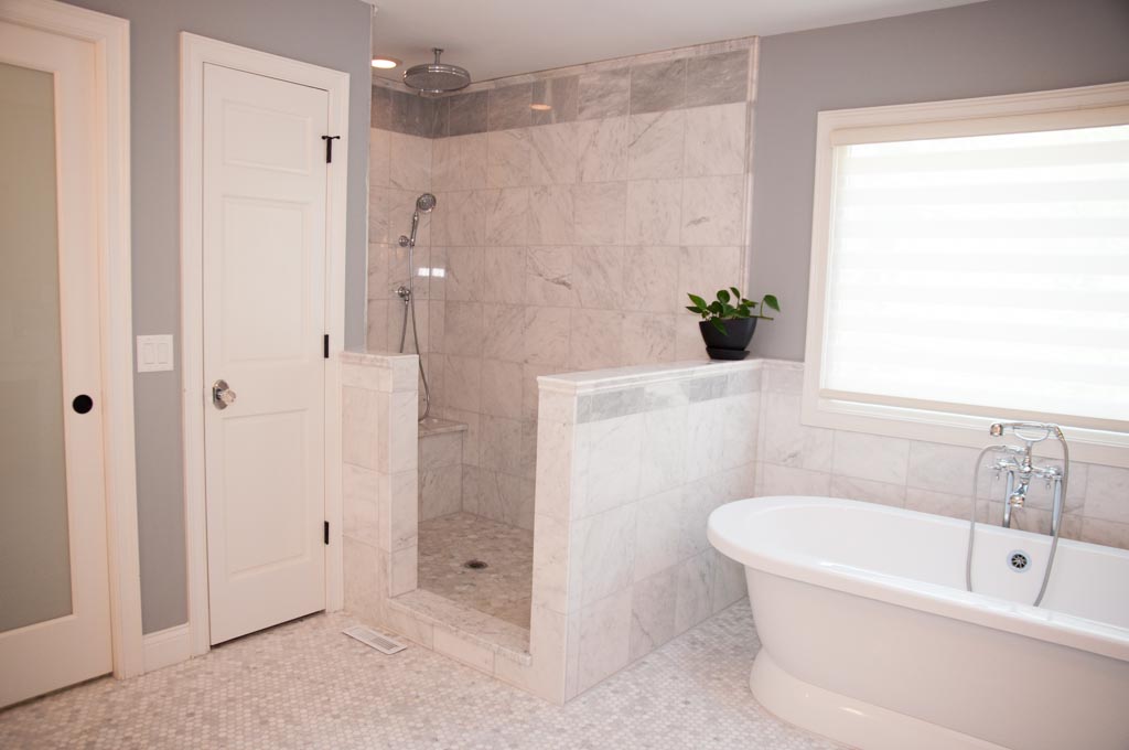 White marble floors and walls, Free standing tub, marble countertops.